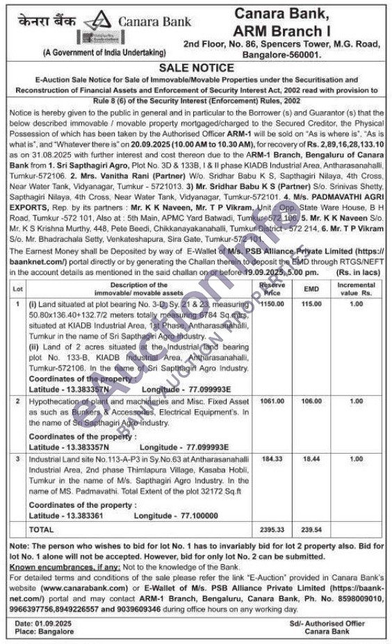 Hypothecation of plant and machineries and Misc. Fixed Asset as such as Bunkers & Accessories, Electrical Equipment's. In the name of Sri Sapthagiri Agro Industry.