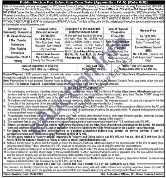 All that part and parcel of the property New Muni No. 35/698, Old Muni No 30/698, 30/861, Soobe Ki Goth, Lashakr, Behind Kailash Talkies, Gwalior, Madhya Pradesh 474001. (Land Area Admeasuring 924 Sq. Ft. And Built Up Area Admeasuring 1266 Sq. Ft.)