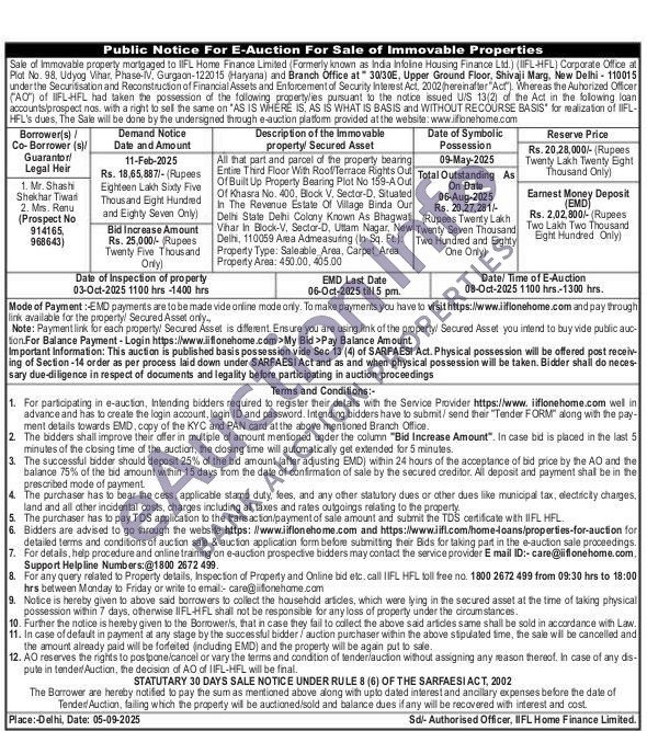 All that part and parcel of the property bearing Entire Third Floor With Roof Terrace Rights Out Of Built Up Property Bearing Plot No 159-A Out Of Khasra No. 400, Block V, Sector-D, Situated In The Revenue Estate Of Village Binda Our Delhi State Delhi Colony Known As Bhagwat Vihar In Block-V. Block-V, Sector-D, Uttam Nagar, New Delhi, 110059 Area Admeasuring (In Sq. FL): Property Type: Saleable Area, Carpet Area Property Area: 450.00, 405.00
