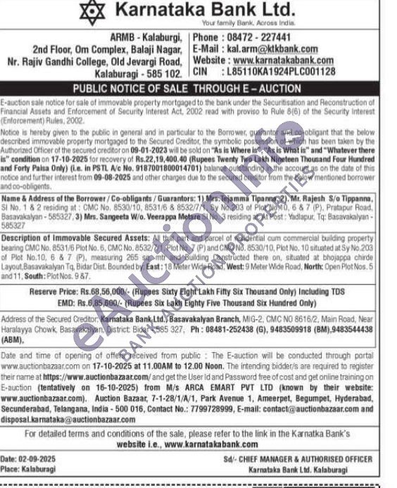 All that part and parcel of residential cum commercial building property bearing CMC No. 8531/6 Plot No. 5, CMC No. 8532/7/1, Plot No. 7 (P) and CMC No. 8530/10, Plot No. 10 situated at Sy No.203 of Plot No.10, 6 & 7 (P), measuring 265 sq. mtr and Building Constructed there on, situated at bhojappa chirde Layout, Basavakalyan Tq. Bidar Dist. Bounded by: East: 18 Meter Wide Road, West: 9 Meter Wide Road, North: Open Plot Nos. 5 and 11, South: Plot Nos. 967.