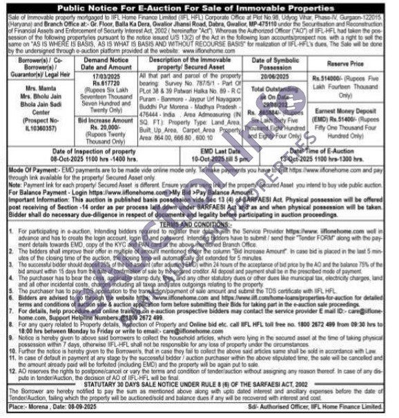 All that part and parcel of the property beanng: Survey No. 787/5/1 Part Of Plot 38 & 39 Patwari Hulka No. 80-RC Puram-Banmore Jaypur Urf Nayogaon Buddhi Pur Morena Madhya Pradesh 476444-India Arta Admeasuring (N) SQ. FT.) Property Type Land Area, Bult Up Area, Carpet Area Property Arna 064.00, 666 80,600 10