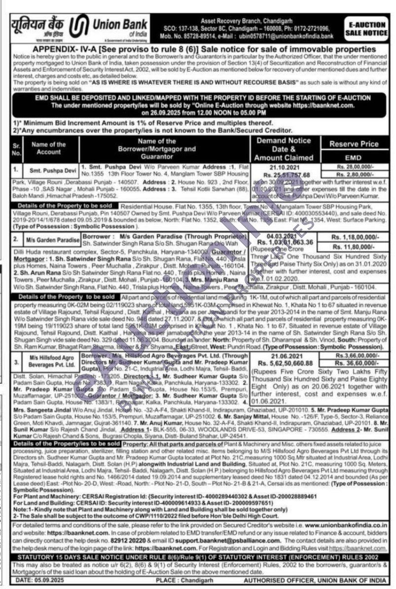 Property: All that parts and parcels of Plant & Machinery and Misc others fixed assets related to juice processing, juice preparation, sterilizer, filling station and other related misc. items belonging to M/S Hillsfood Agro Beverages Pvt Ltd through its Directors sh. Sudheer Kumar Gupta and Mr. Pradeep Kumar Gupta located at Plot No. 210.measuring 1000 Sq. Mtr situated at Industrial Area, Lodhi Majra, Tehsil-Baddi, Nalagarh, Distt. Solan (HP) alongwith Industrial Land and Building, Situated at, Plot No. 21C, measuring 1000 Sq. Meters, Situated at Industrial Area, Lodhi Majra, Tehsil-Baddi, Nalagarh, Distt. Solan (HP) belonging to Hillsfood Agro Beverages Pvt Ltd measuring through Registered lease hold rights and No. 1466/2014 dated 19.09.2014 and supplementary leased deed No 1831 dated 04.12.2014 and bounded (As per Lease dood) East: Plot No-20-D, West Road, North Plot No-21-D, South-Plot No-21-8821-A, Cersal ids as mentioned. (Type of Possession: Symbolic Possession).