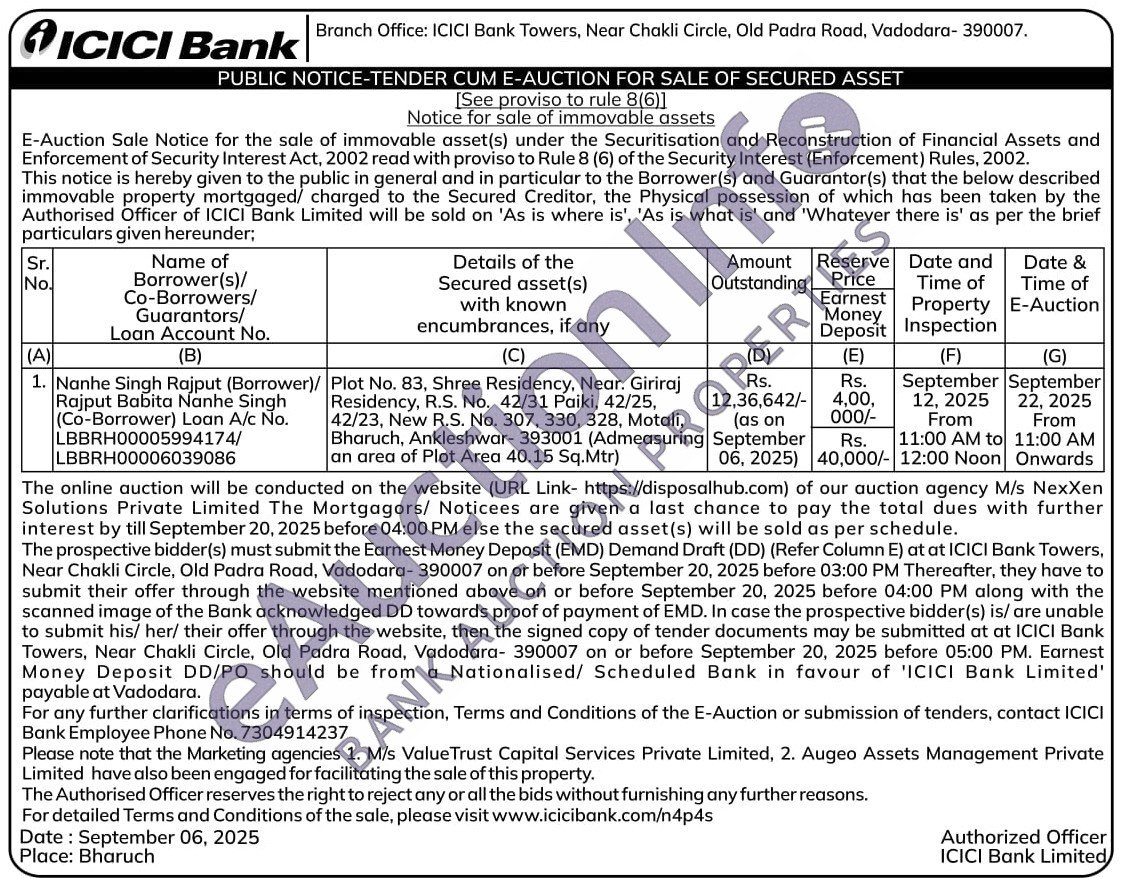 Plot No. 83, Shree Residency, Near. Giriraj Residency, R.S. No. 42/31 Paiki, 42/25, 42/23, New R.S. No. 307, 330, 328, Motali, Bharuch, Ankleshwar-393001 (Admeasuring an area of Plot Area 40.15 Sq.Mtr)