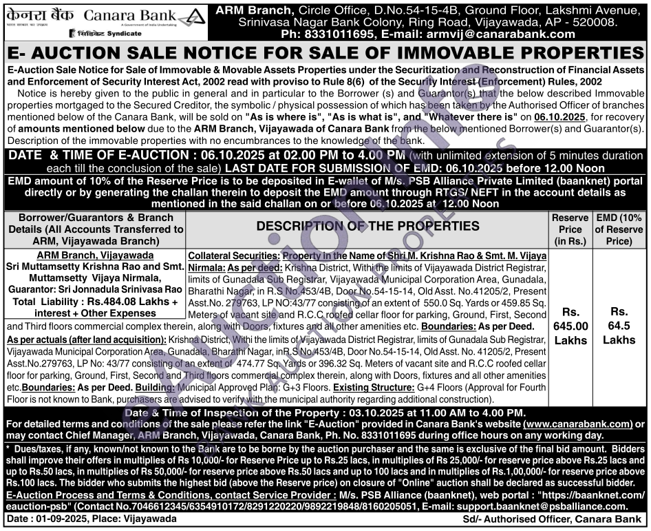 As per actuals (after land acquisition): Krishna District, Withi the limits of Vijayawada District Registrar, limits of Gunadala Sub Registrar, Vijayawada Municipal Corporation Area, Gunadala, Bharathi Nagar, inR.S No.453/4B, Door No.54-15-14, Old Asst. No. 41205/2, Present Asst. No.279763, LP No: 43/77 consisting of an extent of 474.77 Sq. Yards or 396.32 Sq. Meters of vacant site and R.C.C roofed cellar floor for parking, Ground, First, Second and Third floors commercial complex therein, along with Doors, fixtures and all other amenities etc. Boundaries: As per Deed. Building: Municipal Approved Plan: G+3 Floors. Existing Structure: G+4 Floors (Approval for Fourth Floor is not known to Bank, purchasers are advised to verify with the municipal authority regarding additional construction). Date & Time of Inspection of the Property: 03.10.2025 at 11.00 AM to 4.00