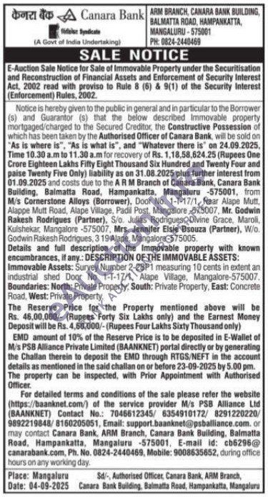 DESCRIPTION OF THE IMMOVABLE ASSETS: Immovable Assets: Survey Number 2-2BP1 measuring 10 cents in extent an industrial shed Door No 1-1-17/1, Alape Village, Mangalore-575007. Boundaries: North: Private Property, South: Private Property, East: Concrete Road, West: Private Property.
