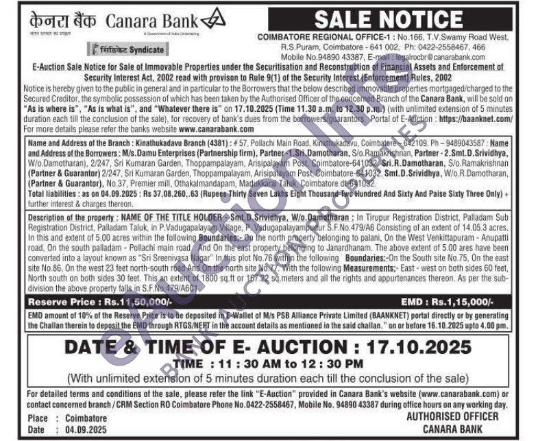 In Tirupur Registration District, Palladam Sub Registration District, Palladam Taluk, in P. Vadugapalayam Village, P. Vadugapalayampudur S.F.No.479/A6 Consisting of an extent of 14.05.3 acres. In this and extent of 5.00 acres within the following Boundaries;- On the north property belonging to palani, On the West Venkittapuram - Anupatti road, On the south palladam Pollachi main road And On the east property belonging to Janardhanam. The above extent of 5.00 ares have been converted into a layout known as "Sri Sreenivasa Nagar" In this plot No.76 within the following Boundaries:-On the South site No.75, On the east site No.86, On the west 23 feet north-south road And On the north site No.77. With the following Measurements;- Eastwest on both sides 60 feet, North south on both sides 30 feet. This an extent of 1800 sq.ft or 167.22 sq.meters and all the rights and appurtenances thereon. As per the sub-division the above property falls in S.F.No.479/A6C1.