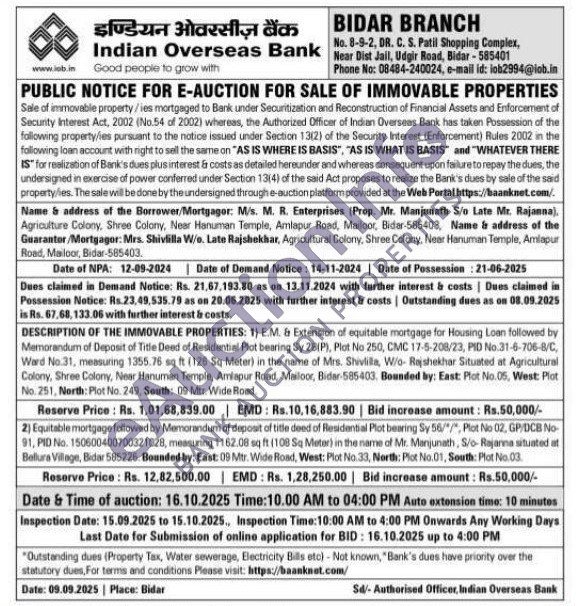 1) EM. & Extension of equitable mortgage for Housing Loan followed by Memorandum of Deposit of Title Deed of Residential Plot bearing Sy 28(P), Plot No 250, CMC 17-5-208/23, PID No.31-6-706-8/C Ward No.31, measuring 1355.76 sq ft (126 Sq Meter) in the name of Mrs. Shivlilla, W/o- Rajshekhar Situated at Agricultural Colony, Shree Colony, Near Hanuman Temple, Amlapur Road, Mailoor, Bider-585403. Bounded by: East: Plot No.05, West: Plot No. 251, North: Plot No. 249, South: 09 Mtr. Wide Road.