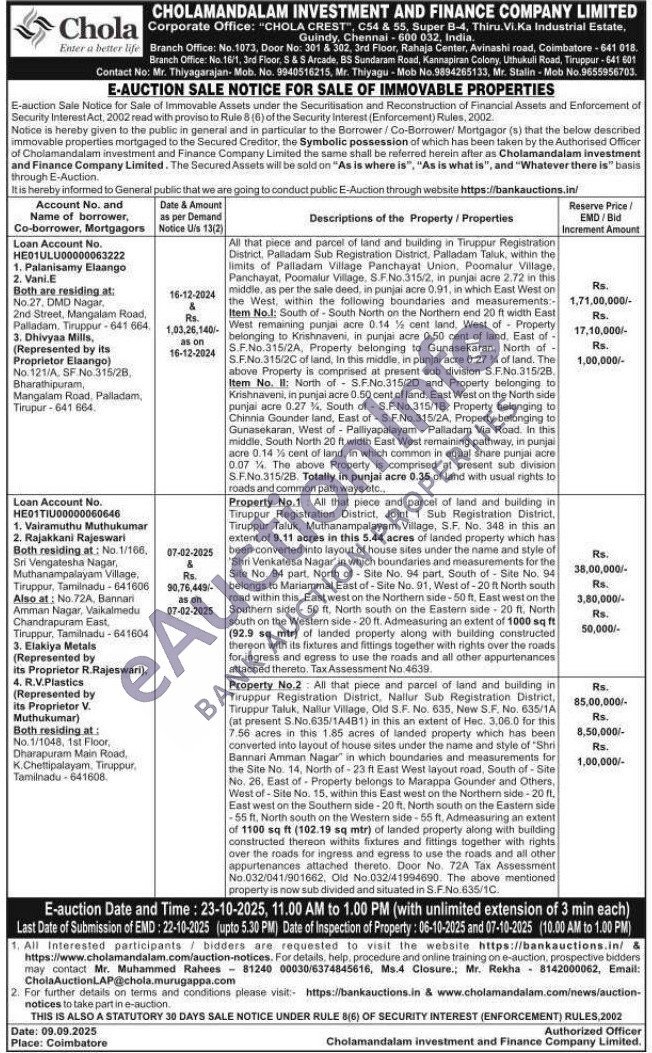 Tiruppur Registration District, Nallur Sub Registration District, Tiruppur Taluk, Nallur Village, Old S.F. No. 635, New S.F. No. 635/1A (at present S.No.635/1A4B1) in this an extent of Hec. 3,06.0 for this 7.56 acres in this 1.85 acres of landed property which has been converted into layout of house sites under the name and style of "Shri Bannari Amman Nagar" in which boundaries and measurements for the Site No. 14, North of-23 ft East West layout road, South of-Site No. 26, East of Property belongs to Marappa Gounder and Others, West of-Site No. 15, within this East west on the Northern side-20 fL, East west on the Southern side-20 ft. North south on the Eastern side -55 ft, North south on the Western side-55 ft, Admeasuring an extent of 1100 sq ft (102.19 sq mtr) of landed property along with building constructed thereon withits fixtures and fittings together with rights over the roads for ingress and egress to use the roads and all other appurtenances attached thereto. Door No. 72A Tax Assessment No.032/041/901662, Old No.032/41994690. The above mentioned property is now sub divided and situated in S.F.No.635/1C