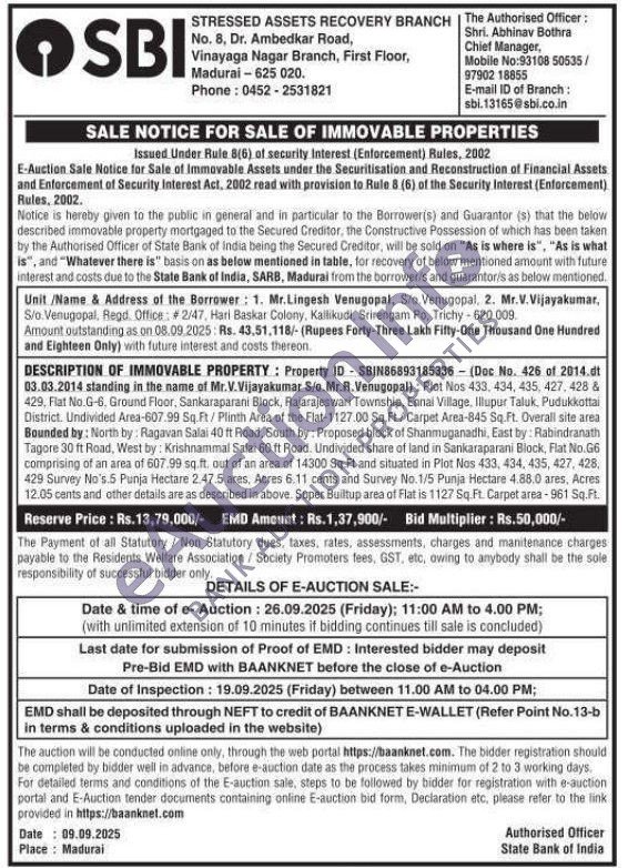 Plot Nos 433, 434, 435, 427, 428 & 429, Flat No.G-6, Ground Floor, Sankaraparani Block, Rajarajeswari Township, Ennai Village, Illupur Taluk, Pudukkottai District. Undivided Area-607.99 Sq. Ft/Plinth Area of the Flat-1127.00 Sq.Ft/Carpet Area-845 Sq.Ft. Overall site area Bounded by: North by: Ragavan Salai 40 ft Road, South by: Proposed block of Shanmuganadhi, East by: Rabindranath Tagore 30 ft Road, West by: Krishnammal Salai 60 ft Road. Undivided share of land in Sankaraparani Block, Flat No.G6 comprising of an area of 607.99 sq.ft. out of an area of 14300 Sq.Ft and situated in Plot Nos 433, 434, 435, 427, 428, 429 Survey No's.5 Punja Hectare 2.47.5 ares, Acres 6.11 cents and Survey No.1/5 Punja Hectare 4.88.0 ares, Acres 12.05 cents and other details are as described in above. Super Builtup area of Flat is 1127 Sq Ft. Carpet area-961 Sq.Ft.