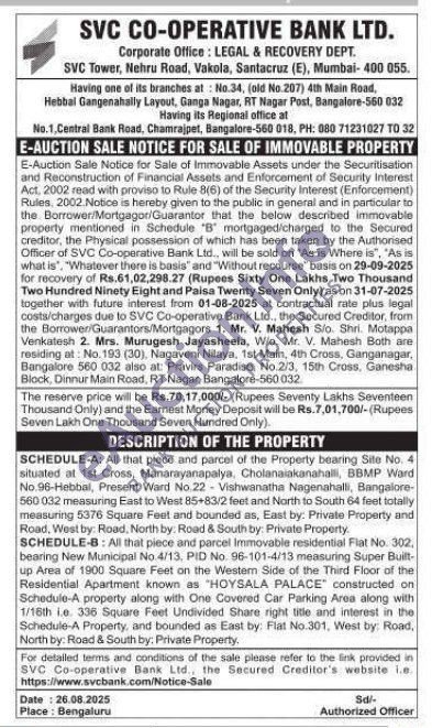 SCHEDULE-A: All that piece and parcel of the Property bearing Site No. 4 situated at 1st Cross, Manarayanapalya, Cholanaiakanahalli, BBMP Ward No.96-Hebbal, Present Ward No.22 Vishwanatha Nagenahalli, Bangalore-560 032 measuring East to West 85+83/2 feet and North to South 64 feet totally measuring 5376 Square Feet and bounded as, East by: Private Property and Road, West by: Road, North by: Road & South by: Private Property