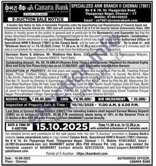 All that piece and parcel of land and building in Plot no.88, Thanthai Periyar Nagar, Periya Thottam Village, Kancheepuram taluk, Kancheepuram District, in Survey No.42/1A, New S.No. 42/43, Patta No. 1545 total extent of 1500 Sq.ft. along with building 550 Sq.ft. Bounded on the: North by: Plot No.75, South by: Director K Govindaraju Street, East by:Plot No.87, West by:Plot No.89. Measuring On: East West Northern Side:30 Feet, East West Southern Side:30 Feet, North South Eastern Side:50 Feet, North South Western Side:50 Feet, Within the Registration District of Kancheepuram and Sub-Registration District of Joint IV Kancheepuram Postal Address: Plot No.88, Door No 88/90, Govindaraj Street Thanthai Periyar Nagar, Periyathottam Village, Kancheepuram Taluk, Kancheepuram District-631501.