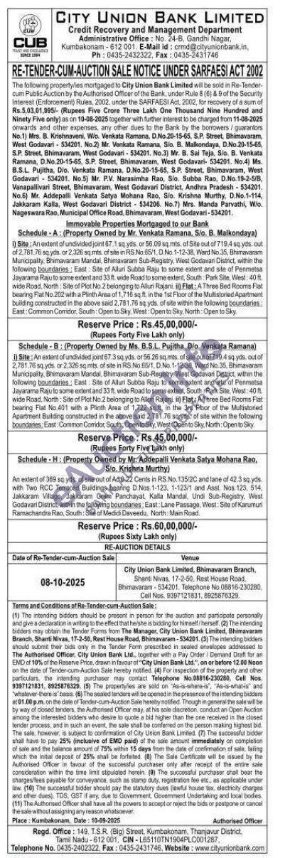 2) Site: An extent of undivided joint 67.3 sq yds. or 56.26 sq.mts of site out of 719.4 sq yds. out of 2,781.76 sq yds, or 2.326 sqmts of site in RS.No.85/1, D.No. 1-12-38, Ward No. 35. Bhimavaram Municipality, Bhimavaram Mandal, Bhimavaram Sub-Registry, West Godavari District, within the following boundaries, East: Site of Alluri Subba Raju to some extent and site of Permetsa Jayarama Raju to some extent and 33ft, wide Road to some extent, South Park Site, West: 40 wide Road, North: Site of Plist No 2 belonging to Allui Rajani Flat: A Three Bed Rooms Flat bearing Flat No.401 with a Plinth Area of 1,722 sq.ft. in the 3rd Floor of the Multistoried Apartment Building constructed in the above said 2,781.76 so yds. of site within the following boundaries, East Common Corridor, South: Open to Siky, West: Open to Sky, North: Open to Sky