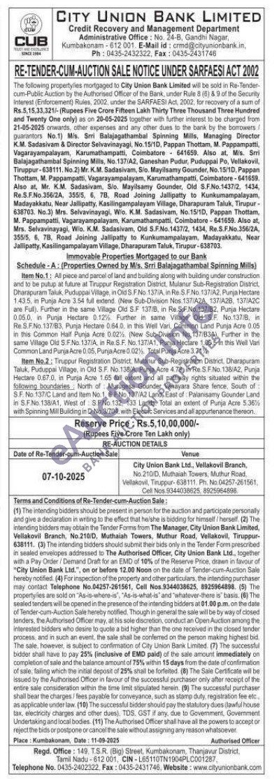 item No.1: All piece and parcel of land and building along with building under construction and to be putup at future at Tiruppur Registration District, Mulanur Sub-Repstraton District, Dharapuram Taluk, Puduppai Village in OldB FNo 137/A in Re S.FNo. 137/A2, Punja Hectare 1435 in in Pu Punja Acre 354 ful extend. (New Sub-Division Nos 137/A2A, 137/A28, 1371A20 ane Ful). Further in the same Vilage Old SF 137/B, in ReS.F.No. 137/82, Purja Hectare 0.06.0, in Punja Hectare 0.125. Further in same Vilage Old SF No.137/8 Re.S.F.No.137/83, Punja Hectare 0.64.6. in this Wiell Vari, Contmon Land Punja Acre 0.05 in this Common Mall Punja Acre 0.02% (New Sub-Division No. 137/83A), Further in the same Village Old S.F.No 1371A, in ReSF. No. 137A1, Purja Hectare 1.06.5 in this Well V Common Land Punja Acre 0.05, Punja Acre 0.02%. Total Punja Acre 3.71% Item No.2: Truppur Registration District, Mulanur Sub-Registration District, Dharapuram Taluk, Puduppai Village, in Old SF. in Old S.F. No.138A, Punja Acre 4.76, in Re.S.FNo.138/A2, Punja Hectare 0.67.0, in Punja Acre 1.65 full extent and all pathway rights situated within the following boundaries North of Murugesa Gounder Vahayara Share fence. South of 8.F. No. 137/C Land and Item hio. 1, SF.No. 137/A2 Land East of Palanisamy Gounder Land in S.FNo. 138/A1, West of SFNo 132 133 Lands. Total an extent of Punja Acre 5.36% with Spinning Mill Building in D No.3/704, with Electric Services and all appurtenance thereon.