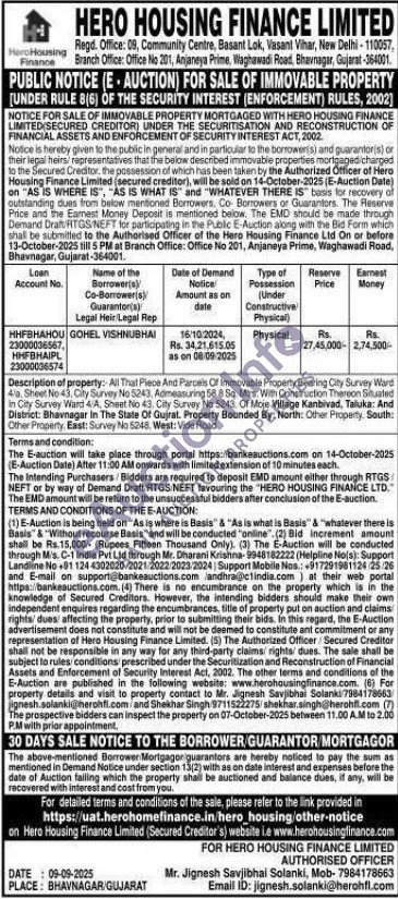 Description of property: All That Piece And Parcels Of Immovable Property Bearing City Survey Ward 4la. Sheet No 43, City Survey No 5243, Admeasuring 58.8 Sq. Mrs. With Construction Thereon Situated In City Survey Ward 4 A, Sheet No 43. City Survey No 5243. Of Moje Village Kanbivad, Taluka: And District: Bhavnagar In The State Of Gujrat. Property Bounded By: North: Other Property, South: Other Property, East: Survey No 5248. West: Vide Road