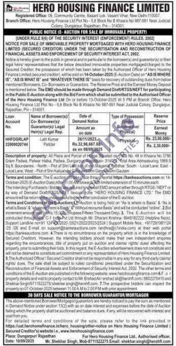 Description of property: All Piece and Parcel of House Situated on Patta No. 48 in Khasra № 3785 Gram Padwa, Patwar Halka, Padwa, Dungarpur, Rajasthan-314023, Total Ares Admeasuring 1869.9 Sq.ft. Boundaries: North: Plot of Shri Lalit son of shri Maganlal Patidhar, South: Local Lane, East Local Lane, West-Plot of Shin Kallyalshri Geba and Shn Ganesh Shri Gautam