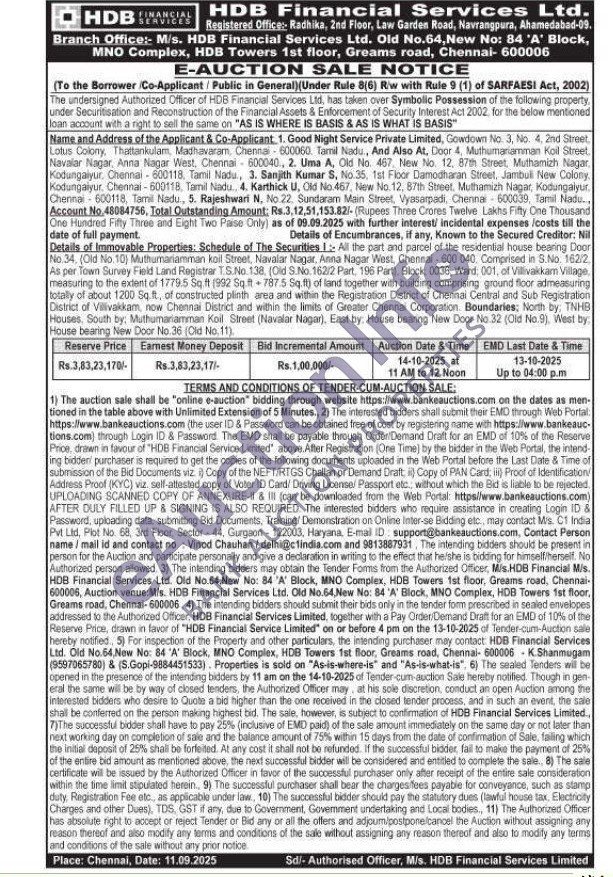 Details of Immovable Properties: Schedule of The Securities 1 All the part and parcel of the residential house bearing Door No.34. (Old No. 10) Muthumariamman koil Street, Navalar Nagar, Anna Nagar West, Chennai-600 040. Comprised in S.No. 162/2 As per Town Survey Field Land Registrar T.S.No. 138. (Old S.No. 162/2 Part., 196 Part), Block, 0036, Ward, 001, of Villivakkam Village measuring to the extent of 1779.5 Sq ft (992 Sq.ft 787.5 Sq.ft) of land together with building comprising ground floor admeasuring totally of about 1200 Sq.ft, of constructed plinth area and within the Registration District of Chennal Central and Sub Registration District of Vilivakkam, now Chennai District and within the limits of Greater Chennai Corporation. Boundaries: North by; TNHB Houses, South by: Muthunariamman Koil Street (Navalar Nagar), East by, House beaning New Door No.32 (Old No.9), West by: House bearing New Door No.36 (Old No. 11).