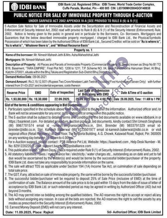 Description of Property: All Pieces and Parcels of Immovable Property (Commercial Property 16 Shops) known as Shop No 81 TO 816, Basement, "TARA EMPIRE, Final Plot NO. 1208 to 1211, T.P. Scheme NO. 04, Near Panchmukha Hanuman Sheri, At Bhuj Katchh-370001, situate within the Bhuj Taluka and Registration Sub-District Bhuj District, Gujrat.