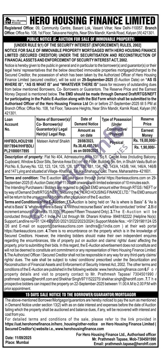 Description of property: Flat No 404, Admeasuring Area 531 Sq.ft. Carpet Area (Including Balcony, Cupboard, Window & Door Sills, Service Area Etc) on 4th Floor, Building No. 6m, in Shubh Vastu Built on Plot No. 6, Survey No. 122, 123, 124, 125, 126, 127, 128, 131, 134, 140, 143/A, 143/B, 144, 146/A, 146/B and 147 Lying and situated at Village-Khativali, Taluka-Shahapur, Dist. Thane, Maharashtra-421601