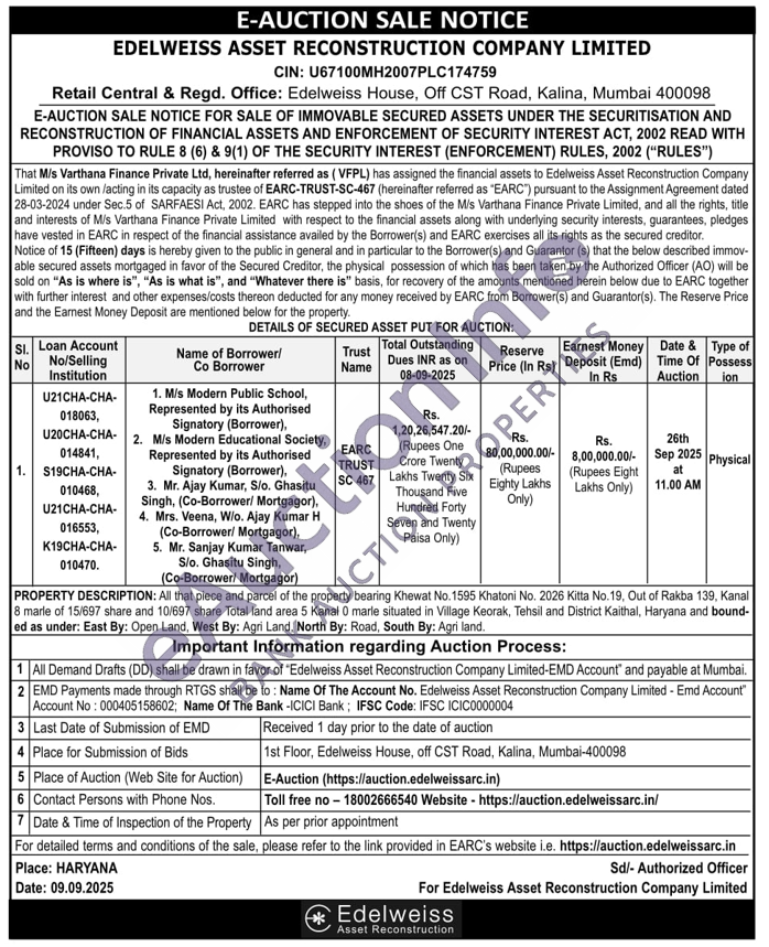 All that piece and parcel of the property bearing Khewat No. 1595 Khatoni No. 2026 Kitta No. 19, Out of Rakba 139, Kanal 8 marle of 15/697 share and 10/697 share Total land area 5 Kanal 0 marle situated in Village Keorak, Tehsil and District Kaithal, Haryana and bound-ed as under: East By: Open Land, West By: Agri Land, North By: Road, South By: Agri land.