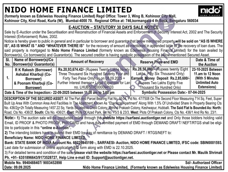 All The Part And Parcel Bearing Flat No. Sf-04, Pid No. 47/7508 On The Second Floor Measuring 714 Sq. Feet, Super Built Up Area With Common Area And Facilities In The Apartment Known As "Ebenezar Apartment" Along With 1.5% Of Undivided Share In Property Bearing Cts No. 436/2g+2h Totally Measuring 1457.22 Sq. Yards Situated At Chelli Colony, Behind Prakash Colony, Keshwapur, Hubballi. The Said Flat Is Bounded As: North: Road, Cts No. 436/2f, South: Cts No. 436/21, East: Plots Of Azad Park, Rs No. 75/3 & 23/3, West: Plots Of Prakash Colony, Cts No. 436/1 And Rs No. 23/1