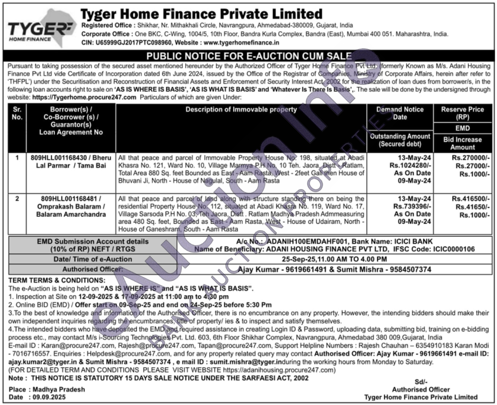 All that peace and parcel of land along with structure standing there on being the residential Property House No. 112, situated at Abadi Khasra No. 119, Ward No. 17, Village Sarsoda P.H No. 03, Teh Jaora, Distt. Ratlam Madhya Pradesh Admmeasuring area 480 Sq. feet, Bounded as East - Aam Rasta, West House of Udairam, North-House of Ganeshram, South - Aam Rasta