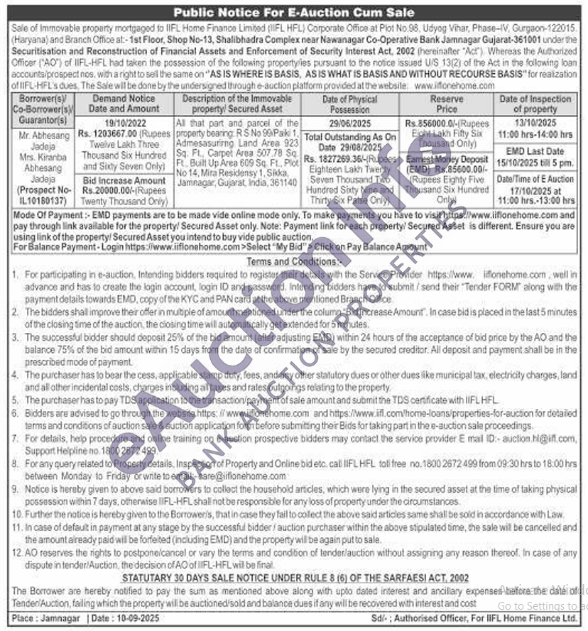 All that part and parcel of the property bearing. RS No 80 Paik 1. Admesasurirng Land Area 923 Sq. Ft, Carpet Area 507.78 Sq Ft. Built Up Area 609 Sq. Ft., Plot No 14, Mira Residensy 1, Sikka, Jamnagar, Gujarat, India, 361140