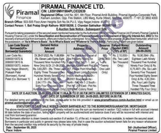 All The Piece And Parcel of The Property Having An Extent-Flat No. T-1, Jan Mangal Appartment Plot No. 257, Peace Point Khandwa Road, Gram Limbodi Indore Indore Madhya Pradesh-452001 Boundaries As North-Flat No.T-2 South Pict No. 258 East-Plot No. 309 West-Colony Road