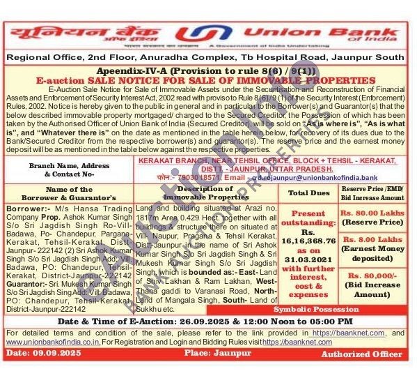 Land and building situated at Arazi no. 1817m Area 0.429 Hect. together with all buildings & structure there on situated at : -Vill- Naupur, Pragana & Tehsil Kerakat, Distt-Jaunpur in the name of Sri Ashok Kumar Singh S/o Sri Jagdish Singh & Sri Mukesh Kumar Singh S/o Sri Jagdish Singh, which is bounded as:-East-Land of Shiv Lakhan & Ram Lakhan, West-Thana gaddi to Varanasi Road, North-Land of Mangala Singh, South- Land of Sukkhu etc.