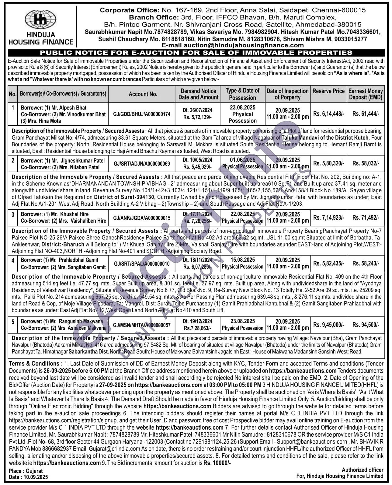 Description of the Immovable Property / Secured Assests: All parts and parcels of non-agriculture immovable Property Bearing Panchayat Property No-7 Paikee Plot NO-25,26/A Paikee Shree Ganesh Residency Paikee Forth floor flat No-402 Ad area 62.82 sq.mt, USL 11.00 sq.mt Situated at limit of Borbatha, Ta-Ankleshwar, District:-Bharuch will Belong to1) Mr. Khusal Sanjay Hire 2)Mrs. Vaishali Sanjay Hire with boundaries asunder: EAST:-land of Adjoining Plot, WEST:-Adjoining Flat NO-403, NORTH:-Adjoining Flat No-401 and SOUTH:-Adjoining Society Road
