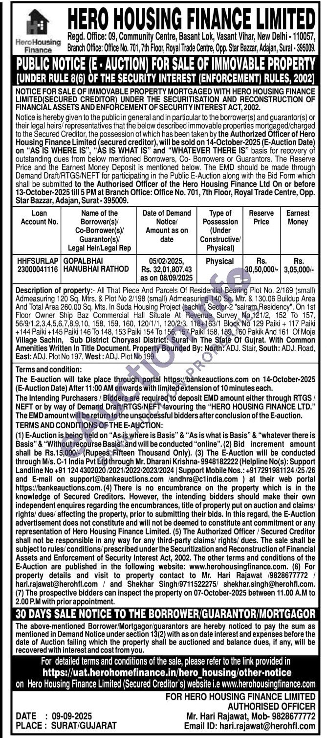 Description of property: All That Piece And Parcels Of Residential Bearing Plot No. 2/169 (small) Admeasuring 120 Sq. Mirs. & Plot No 2/198 (small) Admeasuring 140 Sq. Mtr. & 130.06 Buildup Area And Total Area 260.00 Sq. Mts. In Suda Housing Project (sachin) Sector-2 "sairam Residency". On 1st Floor Owner Ship Baz Commercial Hall Situate At Revenue Survey No.121/2, 152 To 157, 56/9/1,2,3,4,5,6,7,8,9,10, 158, 159, 160, 120/1/1, 120/2/3, 118+163/1 Block No 129 Paiki + 117 Paiki +144 Pailki +145 Paiki 146 To 148, 153 Paiki 154 To 156, 157 Paiki 158, 159, 160 Pakik And 161 Of Moje Village Sachin, Sub District Choryasi District: Surat In The State Of Gujrat. With Common Amenities Written In Title Document. Property Bounded By: North: ADJ. Stair, South: ADJ. Road, East: ADJ. Plot No 197, West: ADJ. Plot No 199