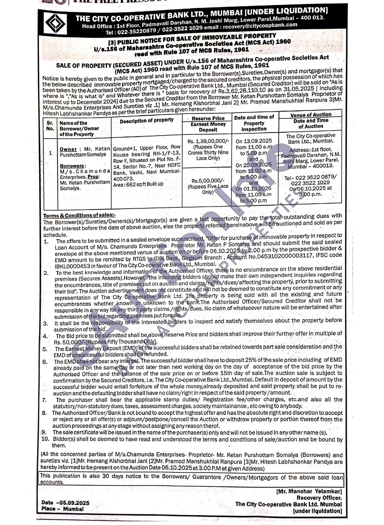 Ground+1, Upper Floor, Row House bearing RH-1/F-13, Row F, Situated on Plot No. F-14, Sector No.-7, Near HDFC Bank, Vashi, Navi Mumbal-400073. Area: 662 sq ft Built up