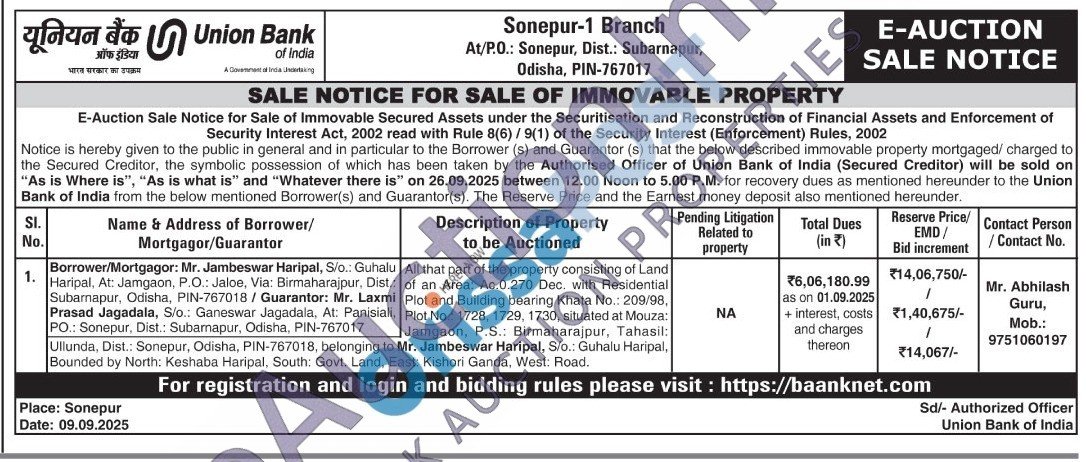 All that part of the property consisting of Land of an Area Ac 0.270 Dec. with Residential Plot and Building bearing Khata No.: 209/98, , Plot. No.: 1728, 1729, 1730, situated at Mouza: Jamgaon, P.S.: Birmaharajpur, Tahasil:Ullunda, Dist.: Sonepur, Odisha, PIN-767018, belonging Bounded by North: Keshaba Haripal, South: Govt. Lang,