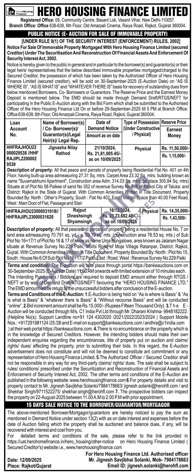 All that peace and parcels of property being Residential Flat No. 401 on 4th Floor, having built-up area admeasuring 27.31 Sq. mtrs. Carpet Area 23.32 Sq. mtrs. building known as name "Suvarnabhumi Apartment", Construction area Adm. 314.03 Sq. mtrs. (at place 305.84 Sq. mtrs) Situate at of Plot No 58 Paikee of sand No 352 of revenue Survey No.398 of Rajkot City of Taluka: and District: Rajkot in the State of Gujarat. With Common Amenities Written in Title Document. Property Bounded By: North: Other's Property, South: Flat No 402, East: Margin Space than 40.00 Feet Road, West: Main Door of Flat, Passage and Stair