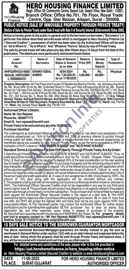 All That Piece And Parcels Of Residential Bearing Plot No. 142, Admeasuring 40.00 Sq. Mtr. Along With 25.54 Sq. Mtr. Undivided Share In The Land Total Admeasuring 65.54 Sq. Mtr., Society Known As "namrata Park Society", Situate At New Revenue Survey No.435, Old Block No 247/1/142, Block No. 247 Paik 1, Old Survey No 9 Khata No 285, Block No 251, Old Survey No 5/A, Block No 285, And Block No. 251, Old Survey No. 5, Block No 290. After Marge All Block New Block No 247/1, Of Moje Village Aamod, Taluka: And Sub District Hansot, And District: Bharuch In The State Of Gujrat. With Common Amenities Written In Title Document. Property Bounded By: East: Adj. Plot No 155, North: Adj. Plot No 141, West: Adj. Society Road, South: Adj. Plot No 143