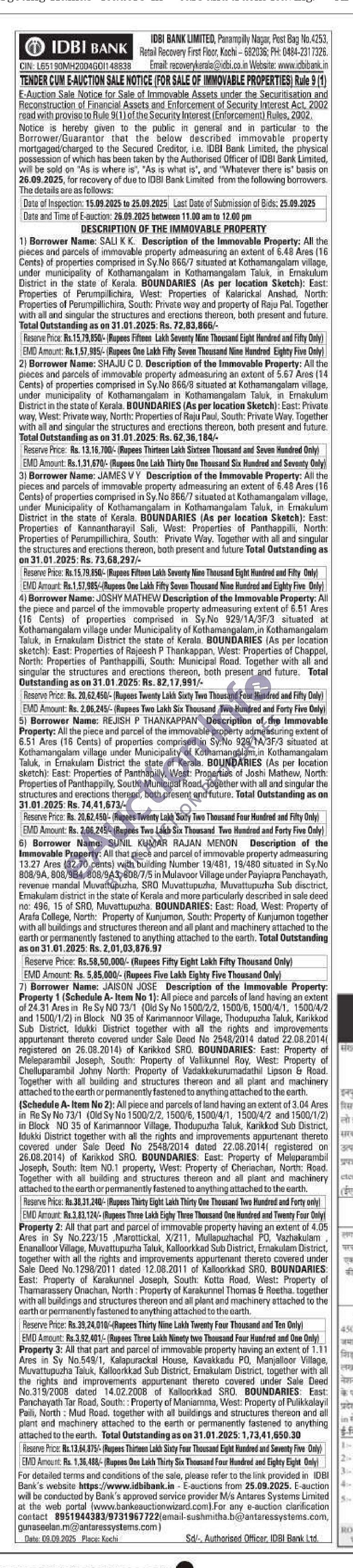 Description of the Immovable Property: All the pieces and parcels of immovable property admeasuring an extent of 6.48 Ares (16) Cents) of properties comprised in Sy. No 866/7 situated at Kothamangalam village, under Municipality of Kothamangalam in Kothamangalam Taluk, in Emakulum District in the state of Kerala, BOUNDARIES (As per location Sketch): East: Properties of Kannantharayil Sali, West: Properties of Panthappilli, North: Properties of Perumpillichira, South: Private Way. Together with all and singular the structures and erections thereon, both present and future Total Outstanding as on 31.01.2025: Rs. 73,68,297/-
