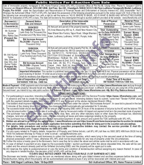 All that part and parcel of the property Plot No. 35, bear-ing Khewat Khatoni No. 99/133 comprised under Khasra No. 54/19/1(7-7), 70/16/1(6-4), 69//20(4-9), 29(24). 70//17/3/4-131/2) Situated at Sundar Nagar-1. Village Bhankharpur, Hadbast No. 236, Sub-Tehsil Zirakpur, Tehsil Derabassi & Distt. SA S. Nagar, Punjab, 140201. Area Adm. (IN SQ. FT.): Property Type: Land Area, Carpet Area, Built Up Area, Super Built Up Area Property Area: 600.00,440.00, 581.000, 540.00