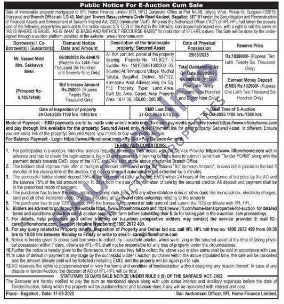 All that part and parcel of the property bearing. Property No. 141/8/2/1, E Swathu No 1501006021002200 36. Situated At Tenmapura Village, Mudhol Taluka, Bagalkot District, 587122 Karnataka Area Admeasuring in Sq Ft.) Property Type Land Area Built Up Area, Carpet Area Property Area 1974.00, 360,00, 288.00