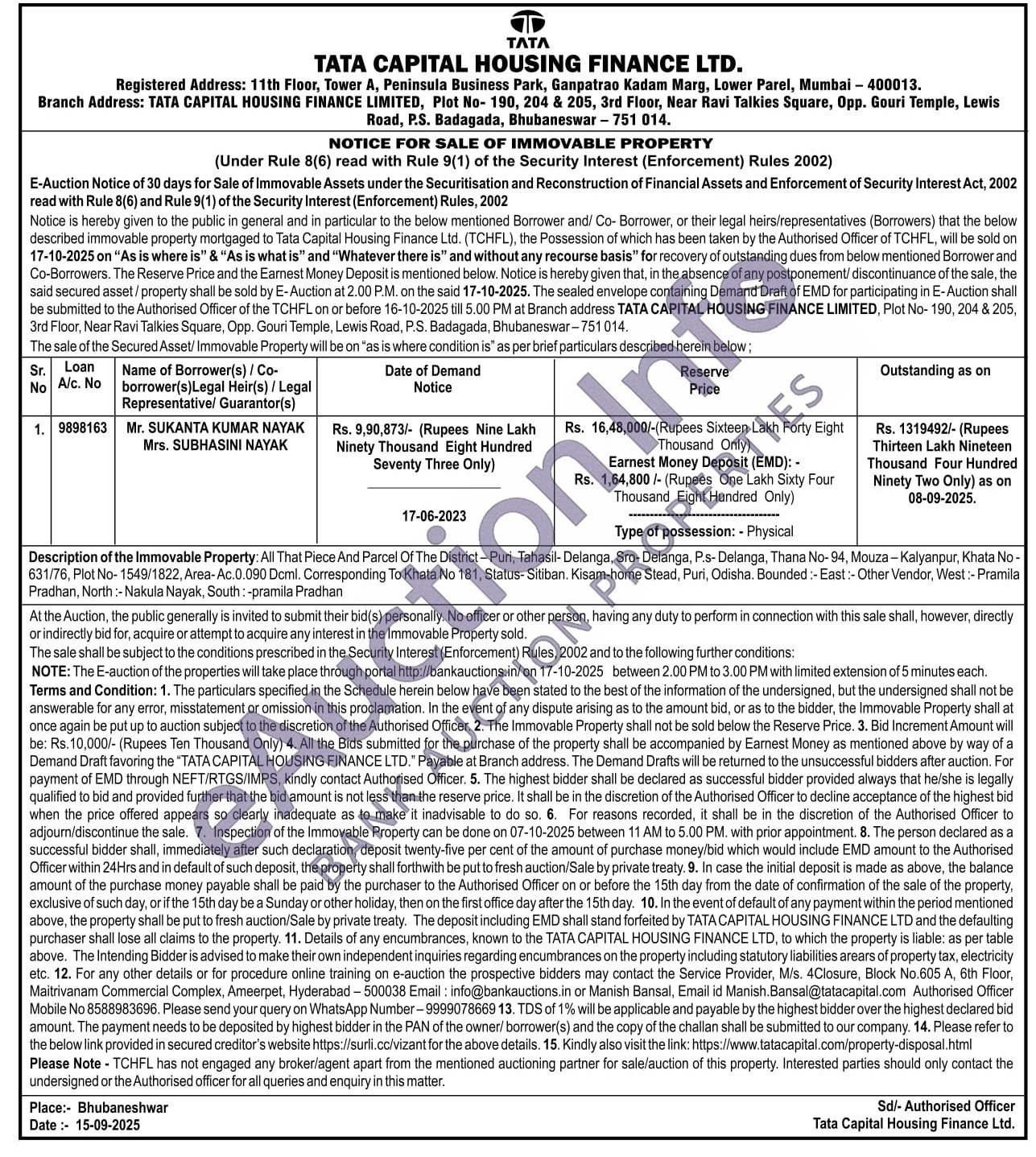 All That Piece And Parcel Of The District-Puri, Tahasil-Delanga, Sro-Delanga, P.s-Delanga, Thana No-94, Mouza-Kalyanpur, Khata No -631/76, Plot No-1549/1822, Area-Ac.0.090 Dcml. Corresponding To Khata No 181, Status-Sitiban. Kisam-home Stead, Puri, Odisha. Bounded:- East:- Other Vendor, West:- Pramila Pradhan, North:- Nakula Nayak, South:-pramila Pradhan