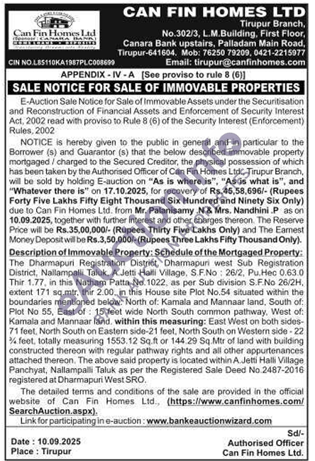 Description of Immovable Property: Schedule of the Mortgaged Property: The Dharmapuri Registration District, Dharmapuri west Sub Registration District, Nallampalli Taluk, A.Jetti Halli Village, S.F.No: 26/2, Pu. Hec 0.63.0 Thir 1.77, in this Natham Patta No. 1022, as per Sub division S.F.No 26/2H, extent 171 sq.mtr, thir 2.00, in this House site Plot No.54 situated within the boundaries mentioned below: North of: Kamala and Mannaar land, South of: Plot No 55, East of 15 feet wide North South common pathway, West of: Kamala and Mannaar land, within this measuring: East West on both sides-71 feet, North South on Eastern side-21 feet, North South on Western side-22 % feet, totally measuring 1553.12 Sq.ft or 144.29 Sq.Mtr of land with building constructed thereon with regular pathway rights and all other appurtenances attached thereon. The above said property is located within A.Jetti Halli Village Panchyat, Nallampalli Taluk as per the Registered Sale Deed No. 2487-2016 registered at Dharmapuri West SRO.