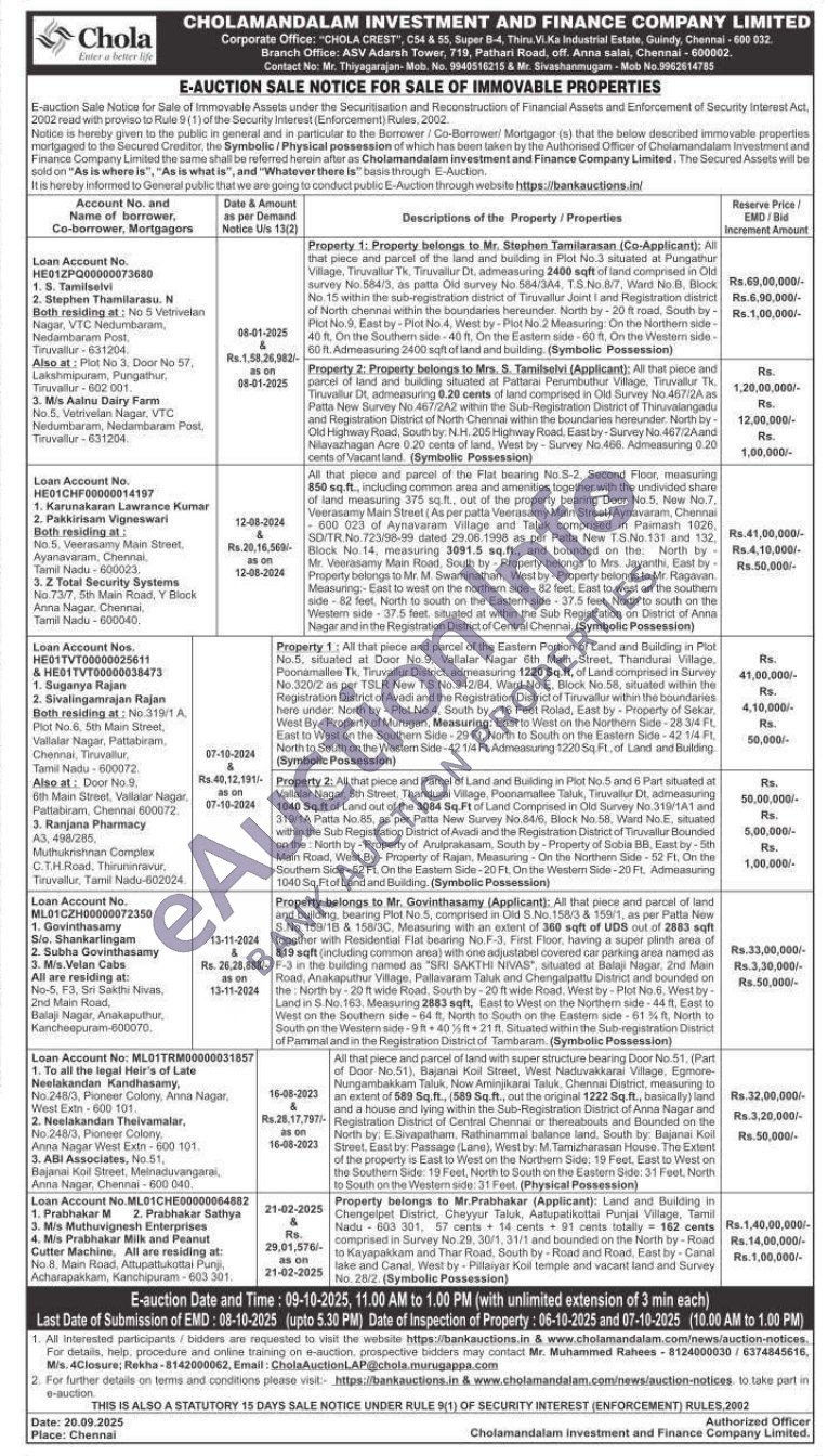 All that piece and parcel of land with super structure bearing Door No.51, (Part of Door No.51), Bajanai Koil Street, West Naduvakkarai Village, Egmore-Nungambakkam Taluk, Now Aminjikarai Taluk, Chennai District, measuring to an extent of 589 Sq.ft., (589 Sq.ft., out the original 1222 Sq.ft., basically) land and a house and lying within the Sub-Registration District of Anna Nagar and Registration District of Central Chennai or thereabouts and Bounded on the North by: E.Sivapatham, Rathinammal balance land, South by: Bajanai Koil Street, East by: Passage (Lane), West by: M. Tamizharasan House. The Extent of the property is East to West on the Northern Side: 19 Feet, East to West on the Southern Side: 19 Feet, North to South on the Eastern Side: 31 Feet, North to South on the Western side: 31 Feet. (Physical Possession)