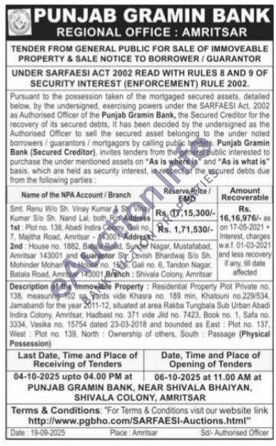 Description of the Immovable Property: Residential Property Plot Private no. 138, measuring 102 sq. yards vide Khasra no. 189 min, Khatouni no.229/534, Jamabandi for the year 2011-12, situated at area Rakba Tungbala Sub Urban Abadi Indira Colony, Amritsar, Hadbast no 371 vide Jild no. 7423, Book no. 1, Safa no 3334, Vasika no. 15754 dated 23-03-2018 and bounded as East: Plot no. 137, West Plot no. 139. North Ownership of others, South Passage (Physical Possession)
