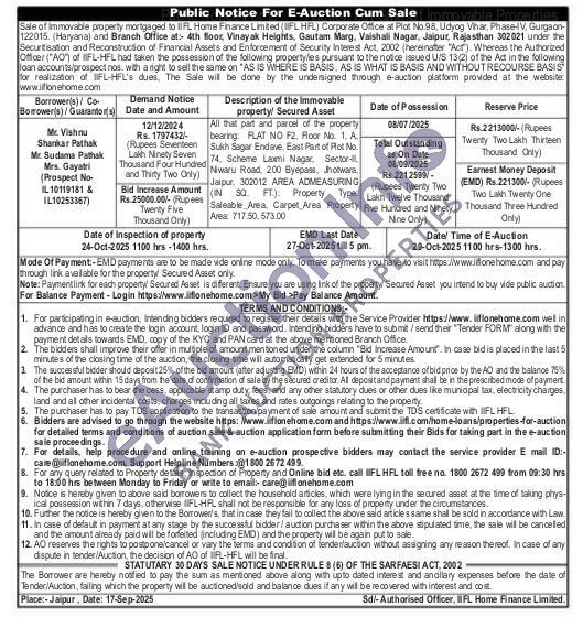 All that part and parcel of the property bearing FLAT NO F2. Floor No. 1. A Sukh Sagar Endave, East Part of Plot No. 74. Scheme Laxmi Nagar, Sector-Niwaru Niwa Road, 200 Byepass, Jhotwara, Jaipur. 302012 AREA ADMEASURING (IN SQ FT.). Property Type Saleable Area. Carpet, Ares Property Area: 717.50, 573.00