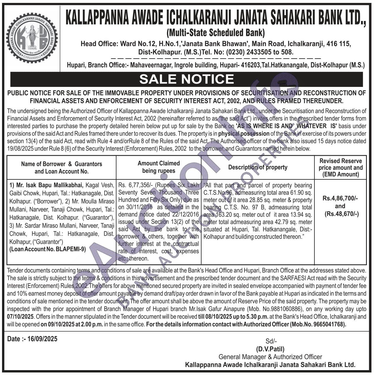 "All that part and parcel of property bearing C.T.S.No.96, admeasuring total area 61.90 sq. meter out of it area 28.85 sq. meter & property bearing C.T.S. No. 97 B, admeasuring total area 163.20 sq. meter out of it area 13.94 sq. meter total admeasuring area 42.79 sq. meter situated at Hupari, Tal. Hatkanangale, Dist:-Kolhapur and building constructed thereon."