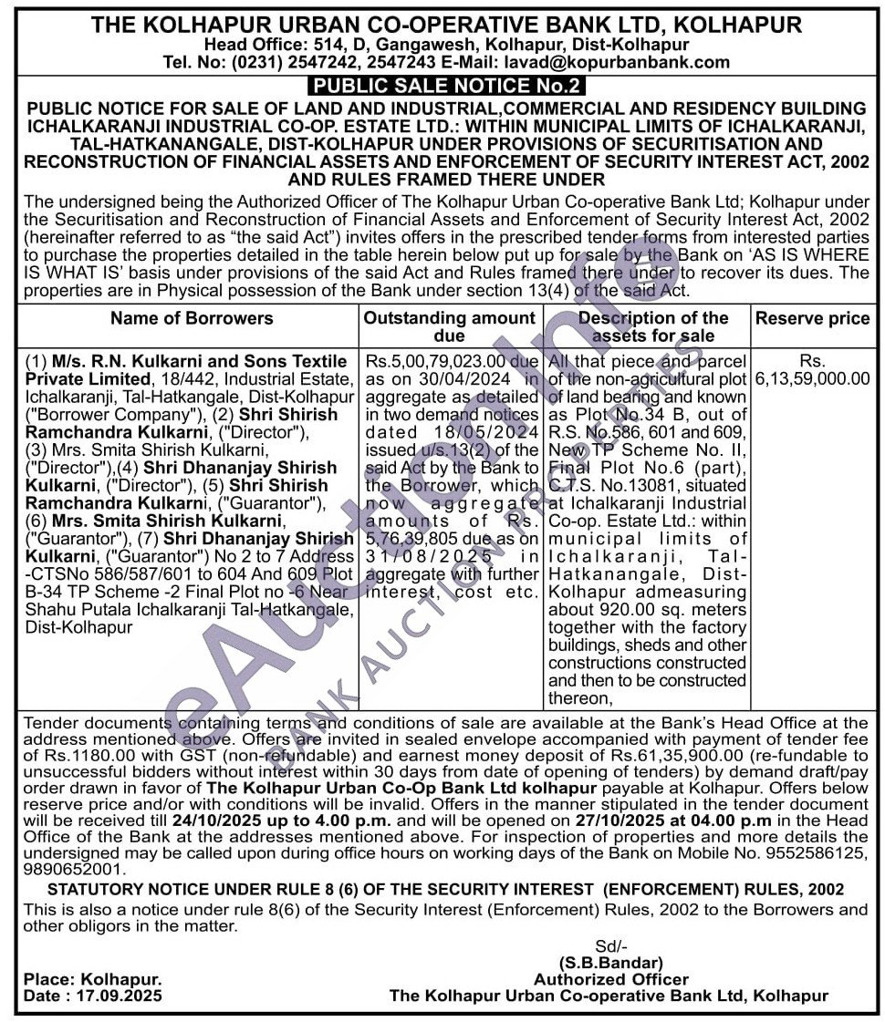 All that piece and parcel of the non-agricultural plot of land bearing and known as Plot No.34 B, out of R.S. No.586, 601 and 609, New TP Scheme No. II, Final Plot No.6 (part), C.T.S. No.13081, situated at Ichalkaranji Industrial Co-op. Estate Ltd.: within municipal municipal limits of Ichalkaranji, Ichalkara Hatkanangale, Dist-Kolhapur admeasuring about 920.00 sq. meters together with the factory buildings, sheds and other constructions constructed and then to be constructed thereon