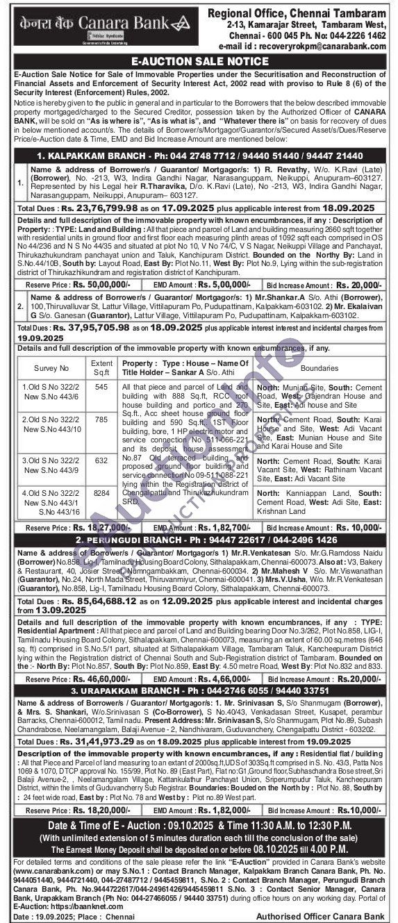 Details and full description of the immovable property with known encumbrances, if any: Description of Property: TYPE: Land and Building: All that piece and parcel of Land and building measuring 2960 sqft together with th residential units in ground floor and first floor each measuring plinth areas of 1092 sqft each comprised in OS No 44/236 and N S No 44/35 and situated at plot No 10. V No 74/C, VS Nagat Neikuppi Village and Panchayat. Thirukazhukundram panchayat union and Taluk, Kanchipuram District. Bounded on the Northy By: Land in S.No. 44/10B, South by: Layout Road, East By: Plot No. 11, West By: Plot No.9, Lying within the sub-registration district of Thirukazhikundram and registration district of Kanchipuram.