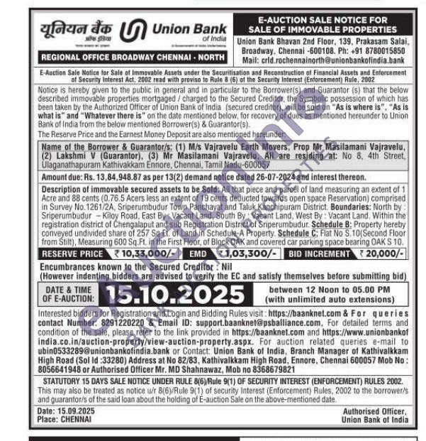 Description of immovable secured assets to be Sold: All that piece and parcel of land measuring an extent of 1 Acre and 88 cents (0.76.5 Acers less an extent of 19 cents deducted towards open space Reservation) comprised in Survey No. 1261/2A, Sriperumbudur Town Panchayat and Taluk Kanchipuram District. Boundaries: North by Sriperumbudur Kiloy Road, East By: Vacant Land, South By: Vacant Land, West By: Vacant Land. Within the registration district of Chengalaput and sub Registration District of Sriperumbudur. Schedule B: Property hereby conveyed undivided share of 257 Sq Ft. of Land in Schedule-A Property Schedule C: Flat No S.10(Second Floor from Stilt), Measuring 600 Sq. Ft. in the First Floor, of Block OAK and covered car parking space bearing OAK S 10