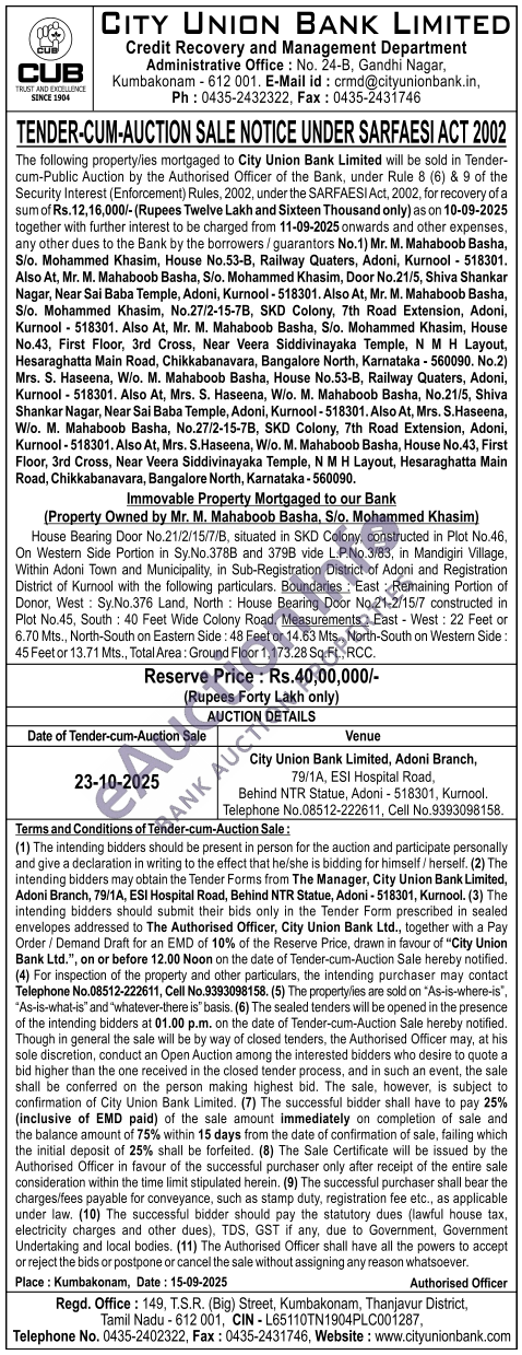 House Bearing Door No.21/2/15/7/B, situated in SKD Colony, constructed in Plot No.46. On Western Side Portion in Sy No.3788 and 3798 vide L.P.No.3/83, in Mandigiri Village, Within Adoni Town and Municipality, in Sub-Registration District of Adoni and Registration. District of Kurnool with the following particulars, Boundaries: East: Remaining Portion of Donor, West: Sy.No.376 Land, North House Bearing Door No.21-2/15/7 constructed in Plot No.45, South: 40 Feet Wide Colony Road. Measurements: East-West: 22 Feet or 6.70 Mts., North-South on Eastem Side: 48 Feet or 14.63 Mts., North-South on Western Side: 45 Feet or 13.71 Mts., Total Area: Ground Floor 1,173.28 Sq.Ft., RCC