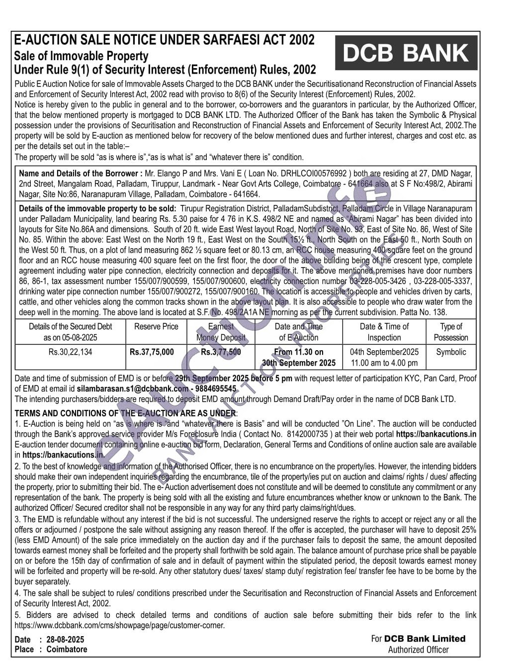 Details of the immovable property to be sold: Tirupur Registration District, PalladamSubdistrict, Palladam Circle in Village Naranapuram under Palladam Municipality, land bearing Rs. 5.30 paise for 4 76 in K.S. 498/2 NE and named as "Abirami Nagar" has been divided into layouts for Site No.86A and dimensions. South of 20 ft. wide East West layout Road, North of Site No. 93, East of Site No. 86, West of Site No. 85. Within the above: East West on the North 19 ft., East West on the South 15% ft., North South on the East 50 ft., North South on the West 50 ft. Thus, on a plot of land measuring 862½ square feet or 80.13 cm, an RCC house measuring 400 square feet on the ground floor and an RCC house measuring 400 square feet on the first floor, the door of the above building being of the crescent type, complete agreement including water pipe connection, electricity connection and deposits for it. The above mentioned premises have door numbers 86, 86-1, tax assessment number 155/007/900599, 155/007/900600, electricity connection number 03-228-005-3426, 03-228-005-3337, drinking water pipe connection number 155/007/900272, 155/007/900160. The location is accessible to people and vehicles driven by carts, cattle, and other vehicles along the common tracks shown in the above layout plan. It is also accessible to people who draw water from the deep well in the morning. The above land is located at S.F. No. 498/2A1A NE morning as per the current subdivision. Patta No. 138.