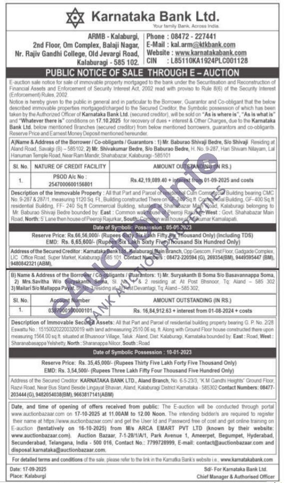 Description of Immovable Secured Assets: All that Part and Parcel of residential building property bearing G. P. No. 2/28 Eswattu No. 151500202200320019 with land admeasuring 2510.06 sq. ft. Along with Ground Floor house constructed there upon measuring 1564.00 sq ft. situated at Bhusnoor Village, Taluk Aland, Dist. Kalaburagi, Karnataka bounded by East: Road, West: Sharanabasappa Yelshetty North: Sharanappa Niloor, South: Road