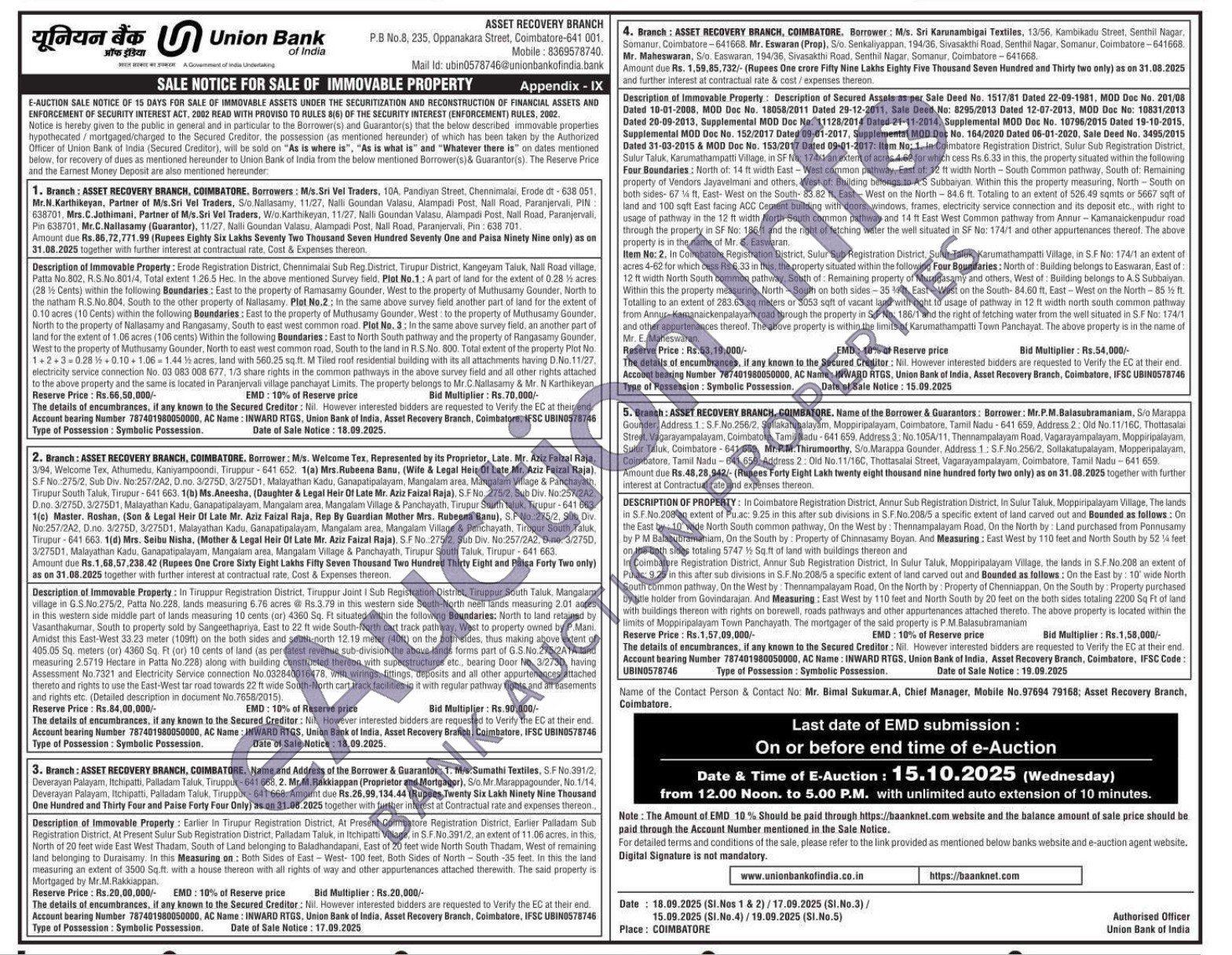 2) In Tiruppur Registration District, Tiruppur Joint I Sub Registration District, Tiruppur South Taluk, Mangalam village in G.S.No.275/2, Patta No.228, lands measuring 6.76 acres Rs.3.79 in this western side South-North neeli lands measuring 2.01 acres in this western side middle part of lands measuring 10 cents (or) 4360 Sq. Ft situated within the following Boundaries: North to land retained by Vasanthakumar, South to property sold by Sangeethapriya, East to 22 ft wide South-North cart track pathway, West to property owned by P.Mani Amidst this East-West 33.23 meter (109ft) on the both sides and south-north 12.19 meter (40ft) on the both sides, thus making above extent of 405.05 Sq. meters (or) 4360 Sq. Ft (or) 10 cents of land (as per latest revenue sub-division the above lands forms part of 6.5.No.275/2A1A land measuring 2.5719 Hectare in Patta No.228) along with building constructed thereon with superstructures etc., bearing Door No. 3/2730, having Assessment No.7321 and Electricity Service connection No 032840016478, with wirings, fittings, deposits and all other appurtenances attached thereto and rights to use the East-West tar road towards 22 ft wide South-North cart track facilities in it with regular pathway rights and all easements and rights etc. (Detailed description in document No. 7658/2015).